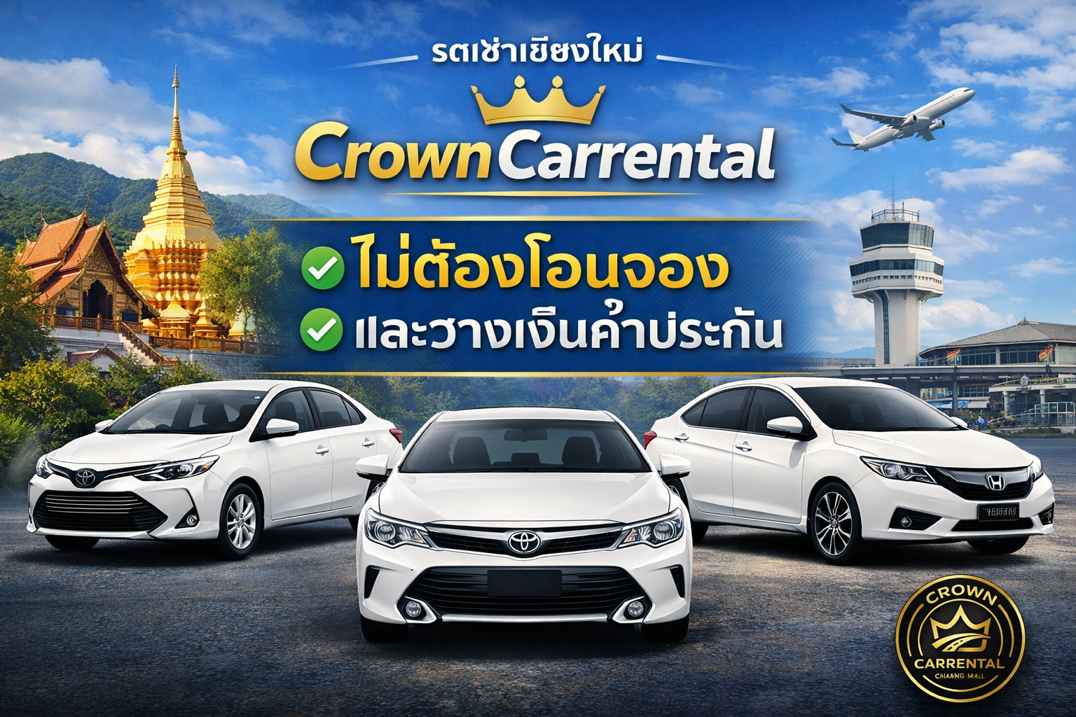 ลูกค้าที่กำลังมองหาบริษัท รถเช่าเชียงใหม่ราคาถูก ไม่ต้องวางเงินค้ำประกัน เพราะประกันรถเช่าทุกคันเป็นประกันแบบพาณิชย์สำหรับรถเช่าเชียงใหม่ ต้อง CROWN CARRENTAL อุ่นใจเมื่อใช้บริการ ภายใต้สโลแกน